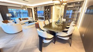 Leicht mutfaklar, Dekton tezgâh, Gaggenau ankastre; banyolarda Villeroy & Boch, Axor ve Hüppe sistemleri kullanıldı. İtalya ve İspanya menşeli büyük ebatlı seramikler ve Ideal Legno parke uygulamasıyla iç mekân kalitesi üst seviyeye taşındı.